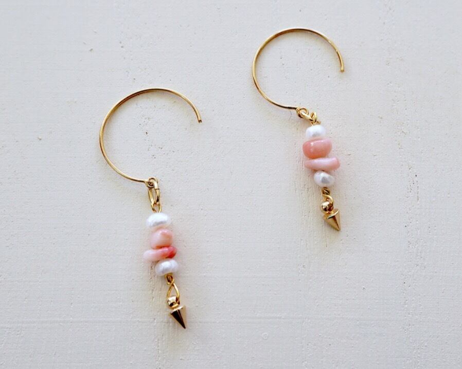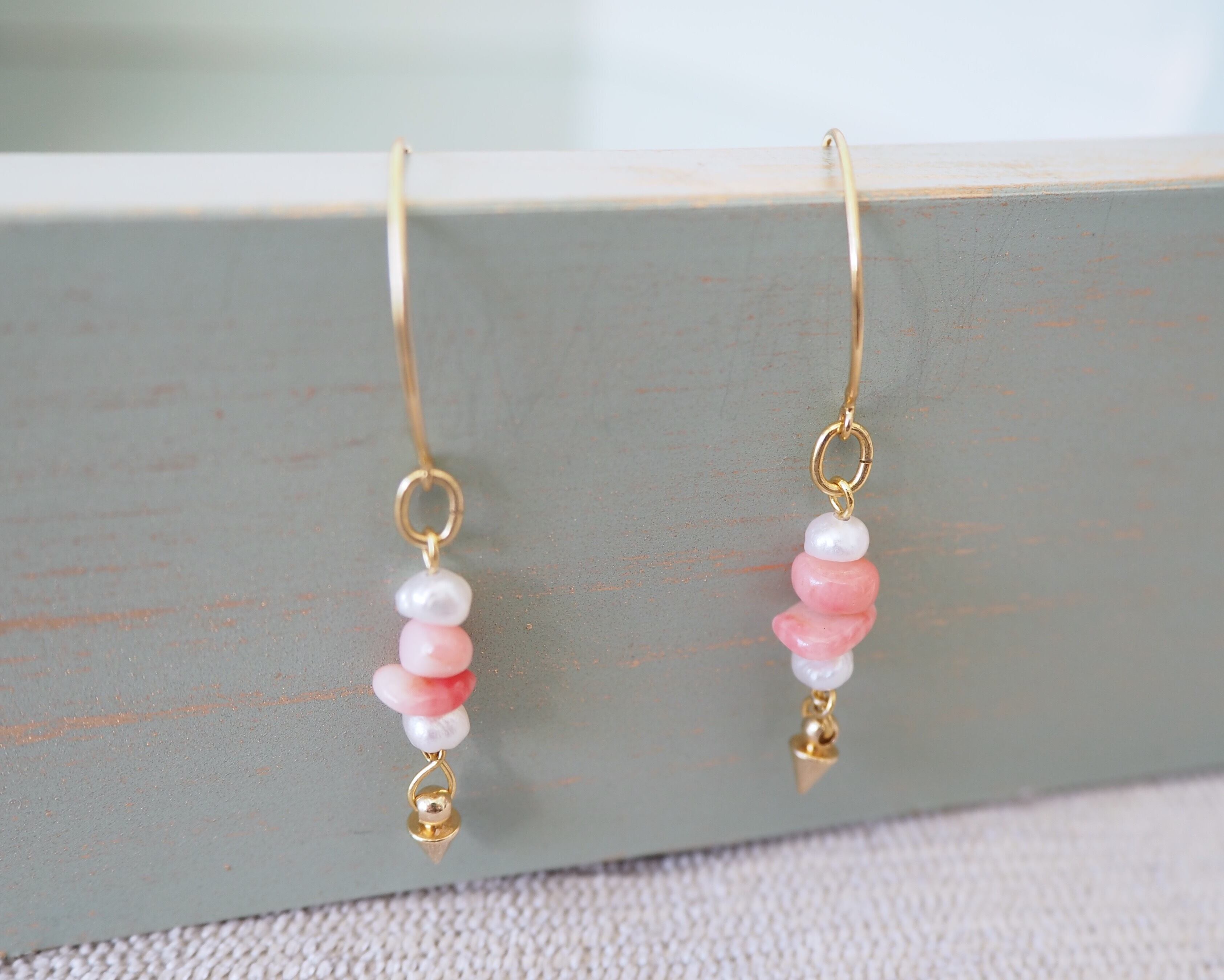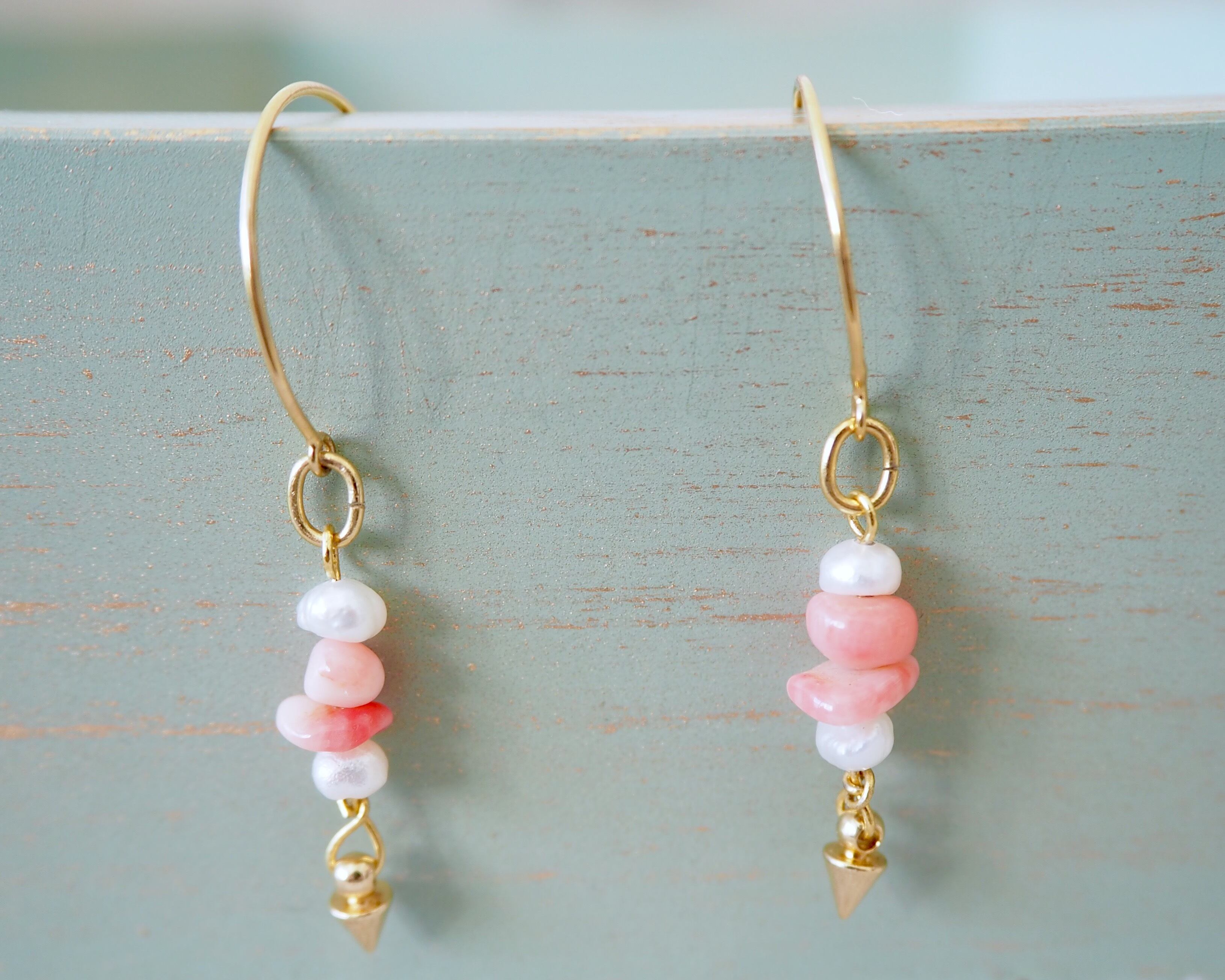 可愛いらしいピンク珊瑚と淡水パール×クールなミニスタッズコーン。 対極なイメージを持つものを組み合わせることで甘辛ミックスなデザインのピアスになりました。 珊瑚の色がとてもかわいらしいピンク色をしています。 淡水パールと合わせることで、より女性らしさを感じさせるデザインです。 *素材 銅製 珊瑚 淡水パール ※イヤリングご希望の方は備考欄にイヤリング希望と記載をお願い致します。