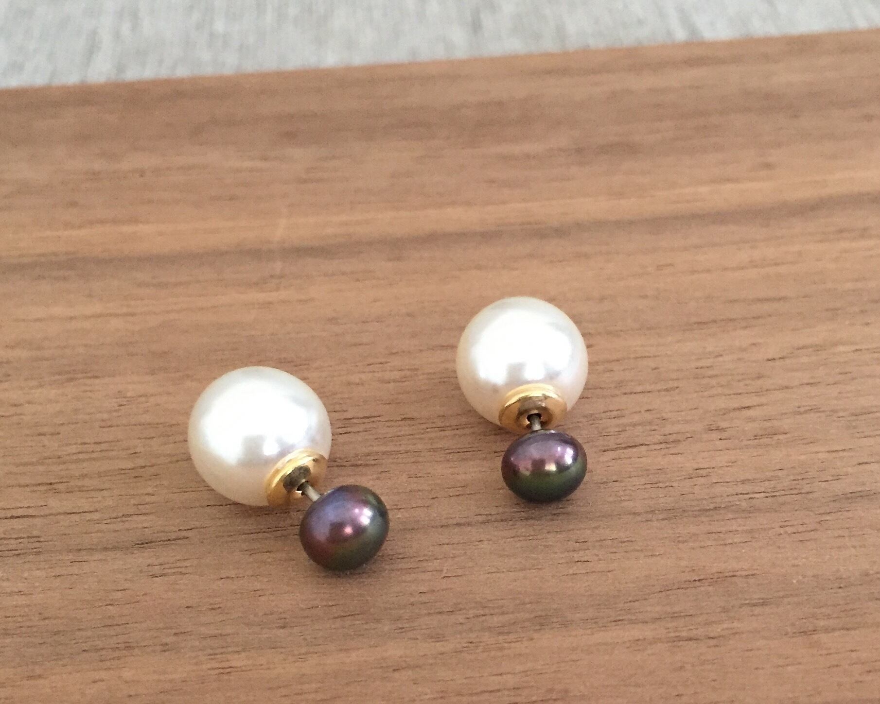 ブラック淡水パール6mm × パールキャッチ10mm ダブルパール2WAY バックキャッチピアス 天然石 パワーストーン ピアス