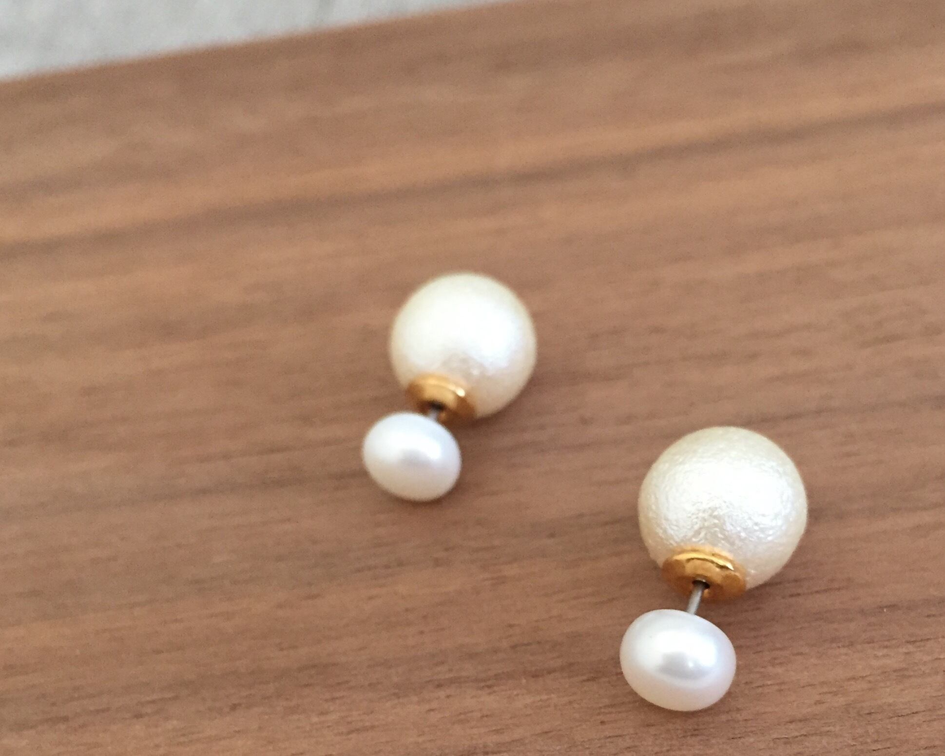 ホワイト淡水パール6mm × パールキャッチ10mm ダブルパール2WAYバックキャッチピアス 天然石 パワーストーン ピアス