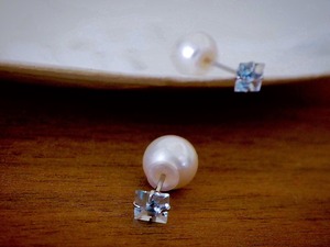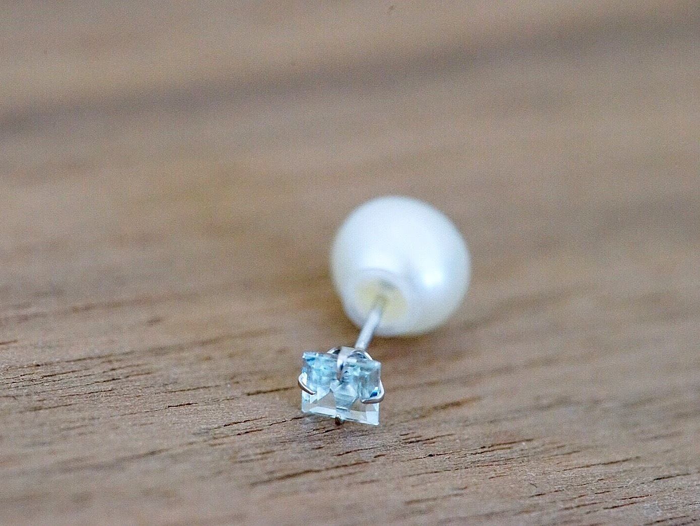 とてもシンプルですが、末長く使っていただけるデザインです。 良質なアクアマリンの輝きに小さめのパールキャッチがとても上品でエレガントな雰囲気を演出してくれます。 キャッチが2つ付いているので、気分や場所によって使い分けできます。 *素材* 14KWG(14金ホワイトゴールド) アクアマリン 約4mm 淡水or貝パールキャッチ 約6mm 14KWGキャッチ