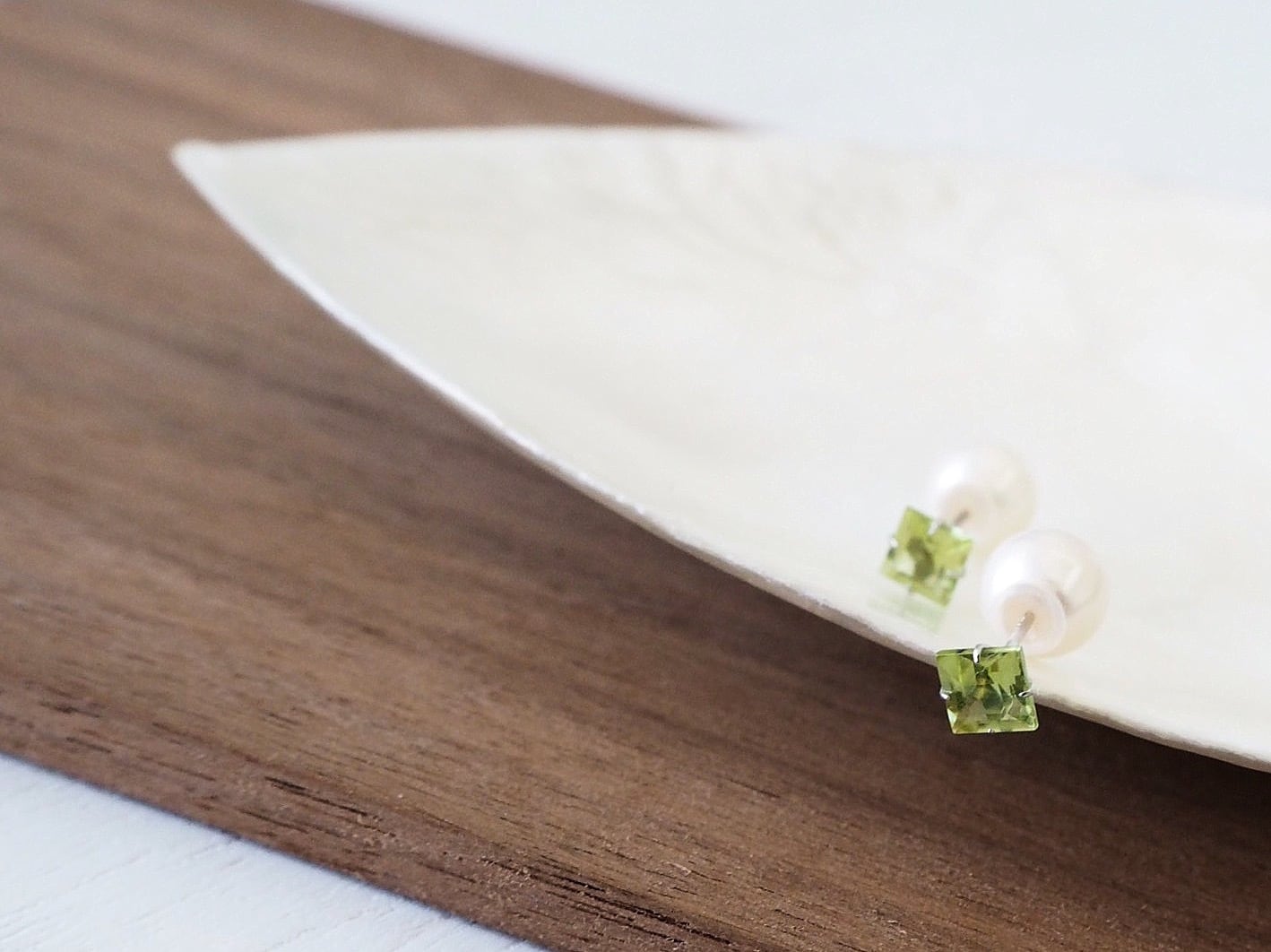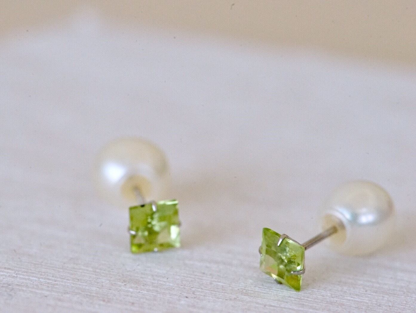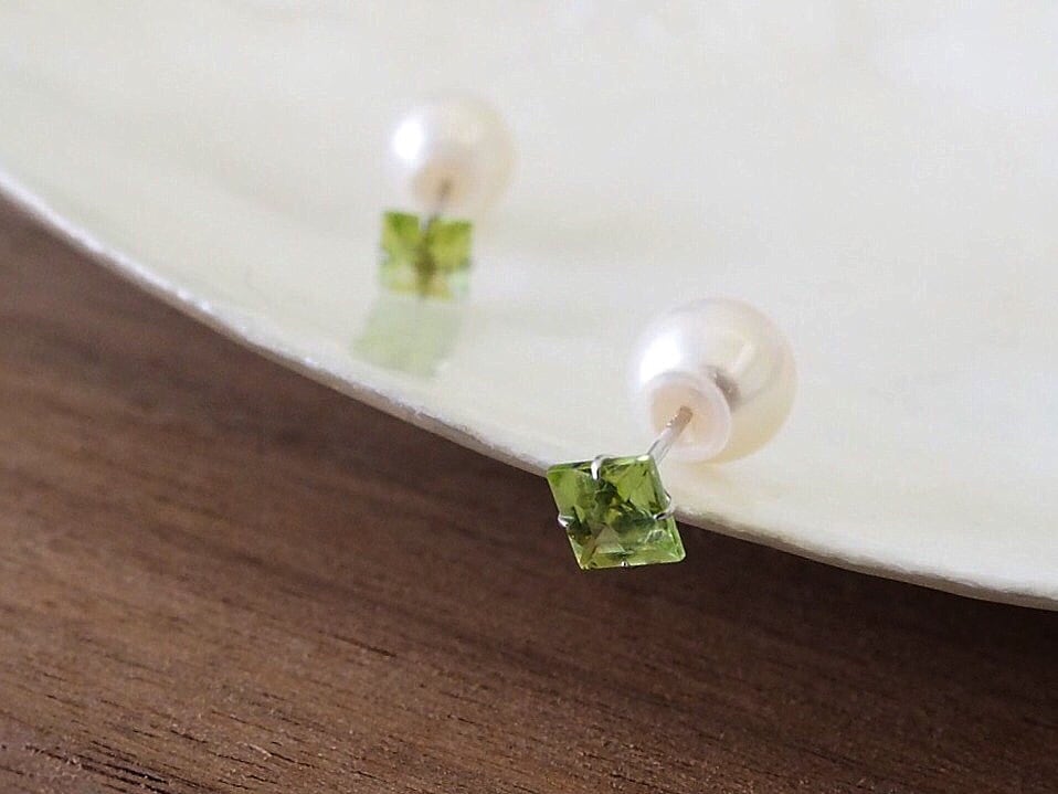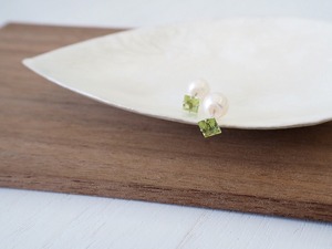 とてもシンプルですが、末長く使っていただけるデザインです。 14金ホワイトゴールド素材になります。 良質なペリドットの輝きに小さめのパールキャッチがとても上品でエレガントな雰囲気を演出してくれます。 キャッチが2つ付いているので、気分や場所によって使い分けできます。 *素材* 14KWG(14金ホワイトゴールド) ペリドット 約4mm 淡水or貝パールキャッチ 約6mm 14KWGキャッチ