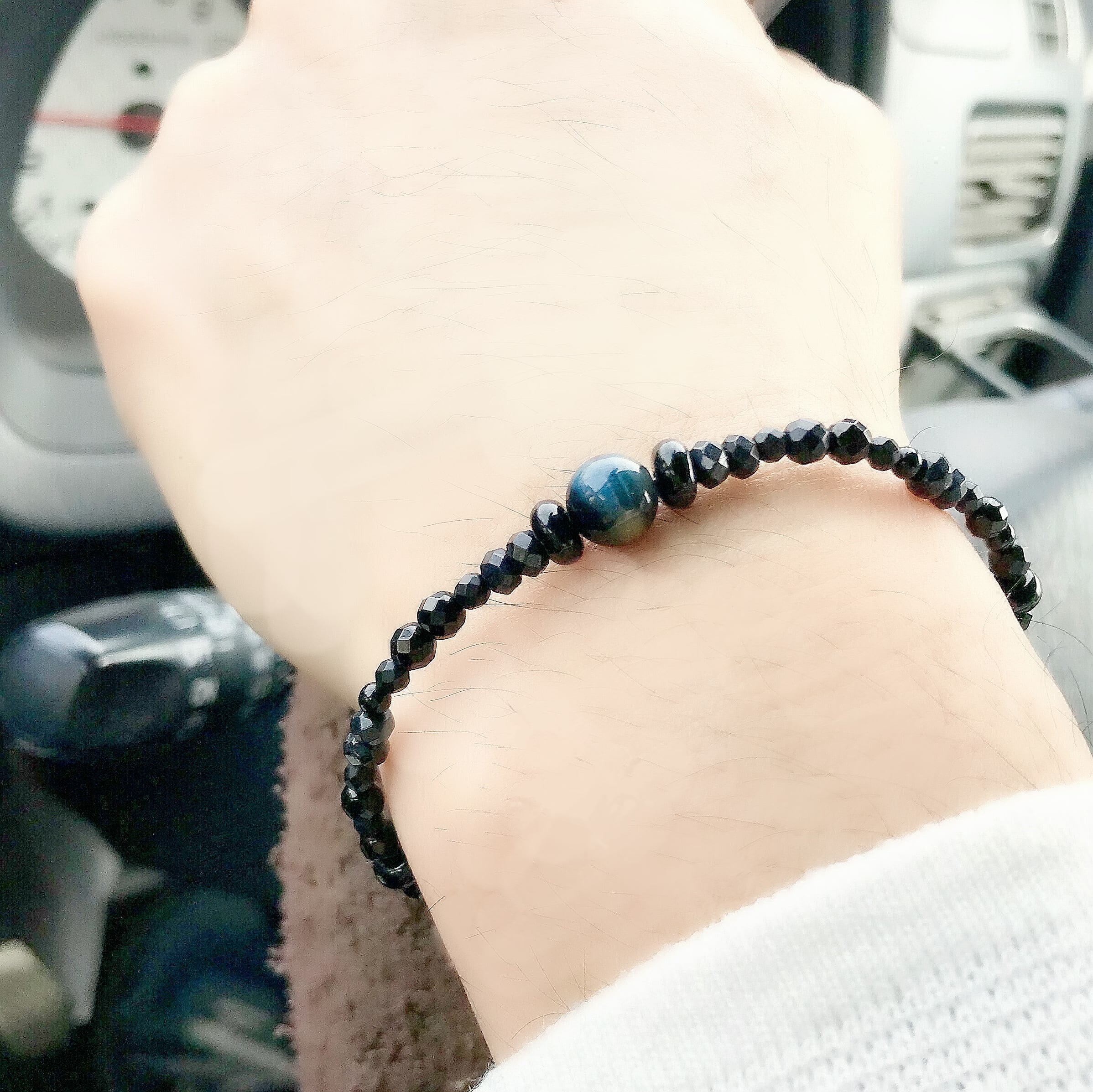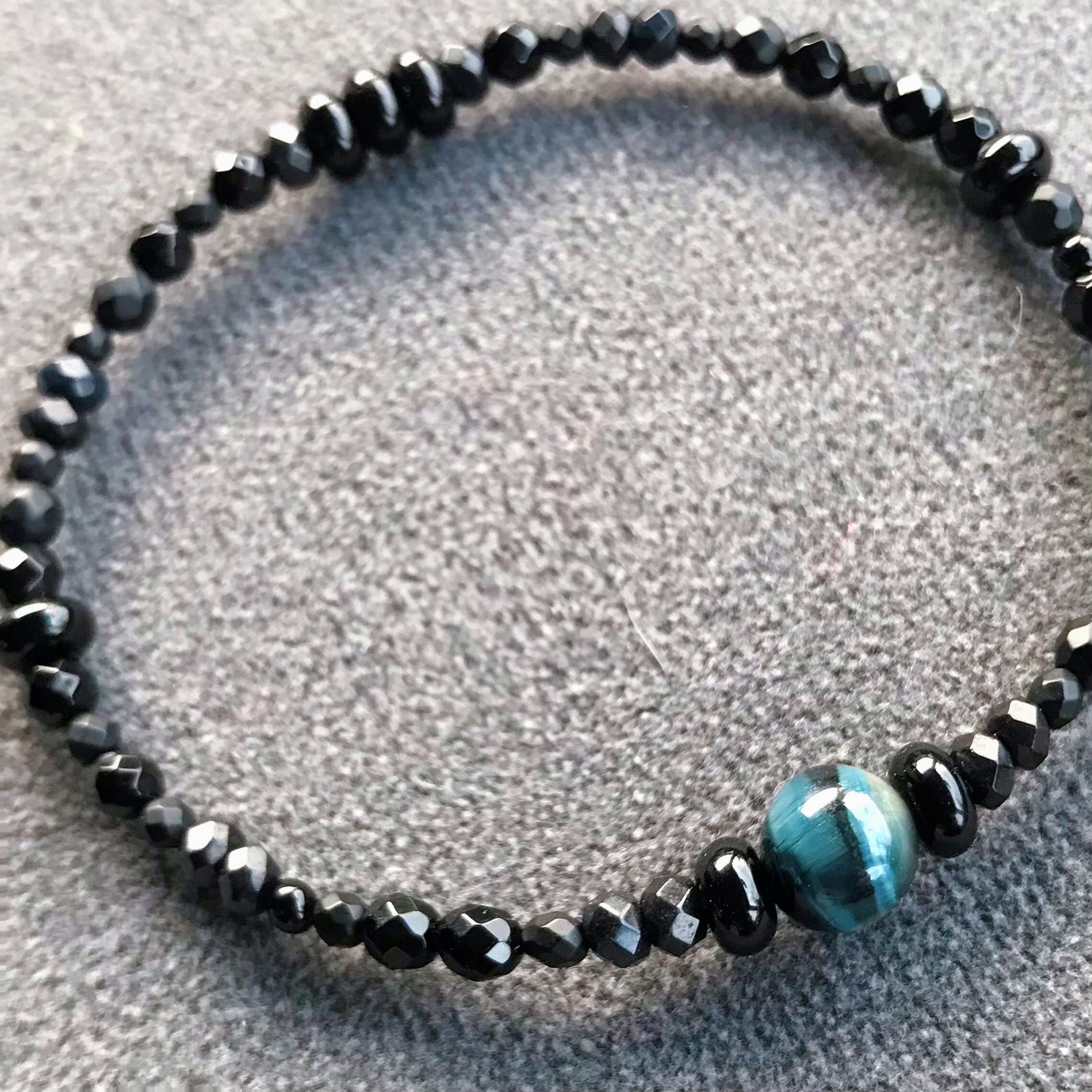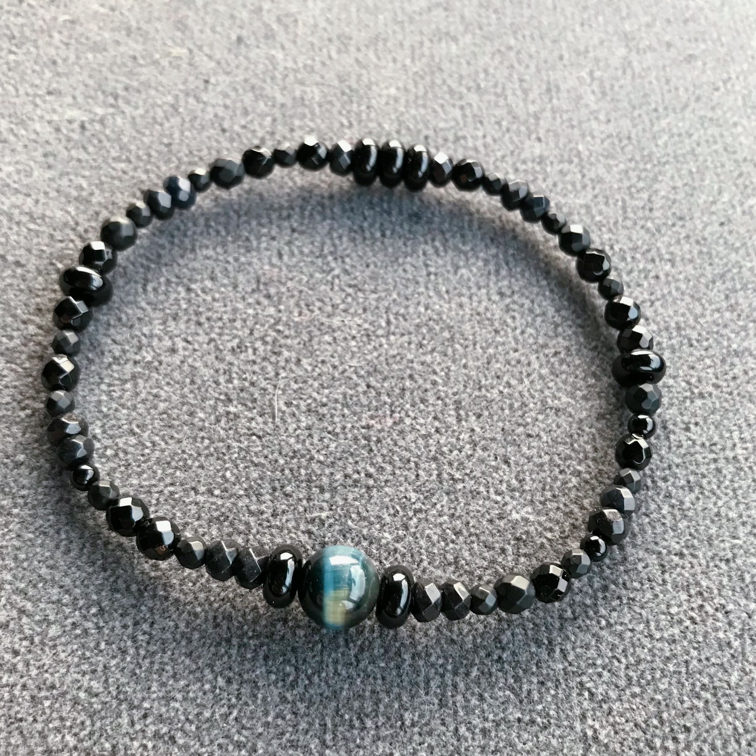 神秘的な深い色合いのブルーのタイガーアイとマットなブラックのオニキスをあわせました。