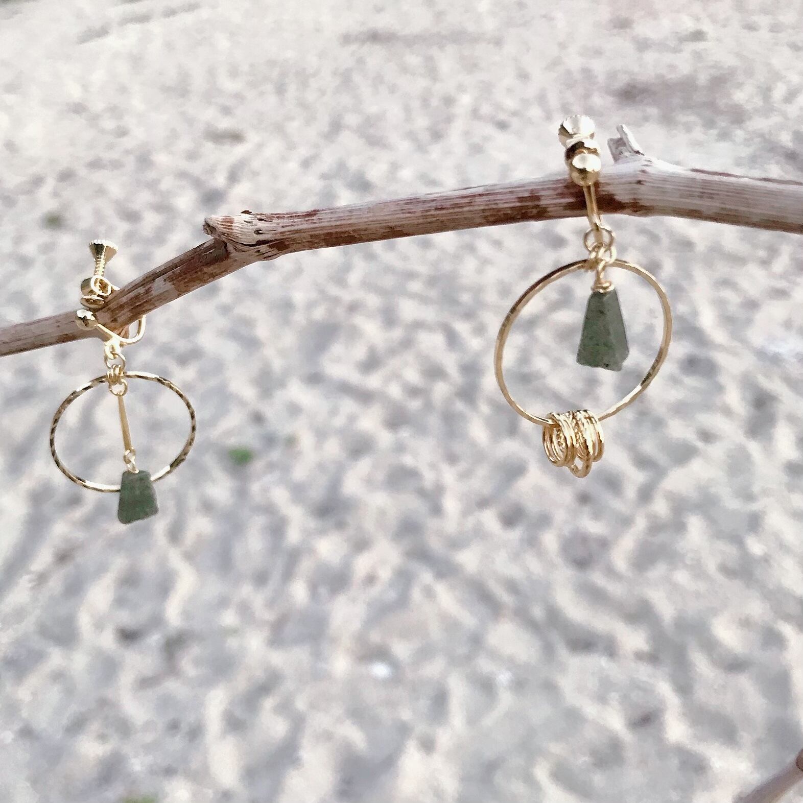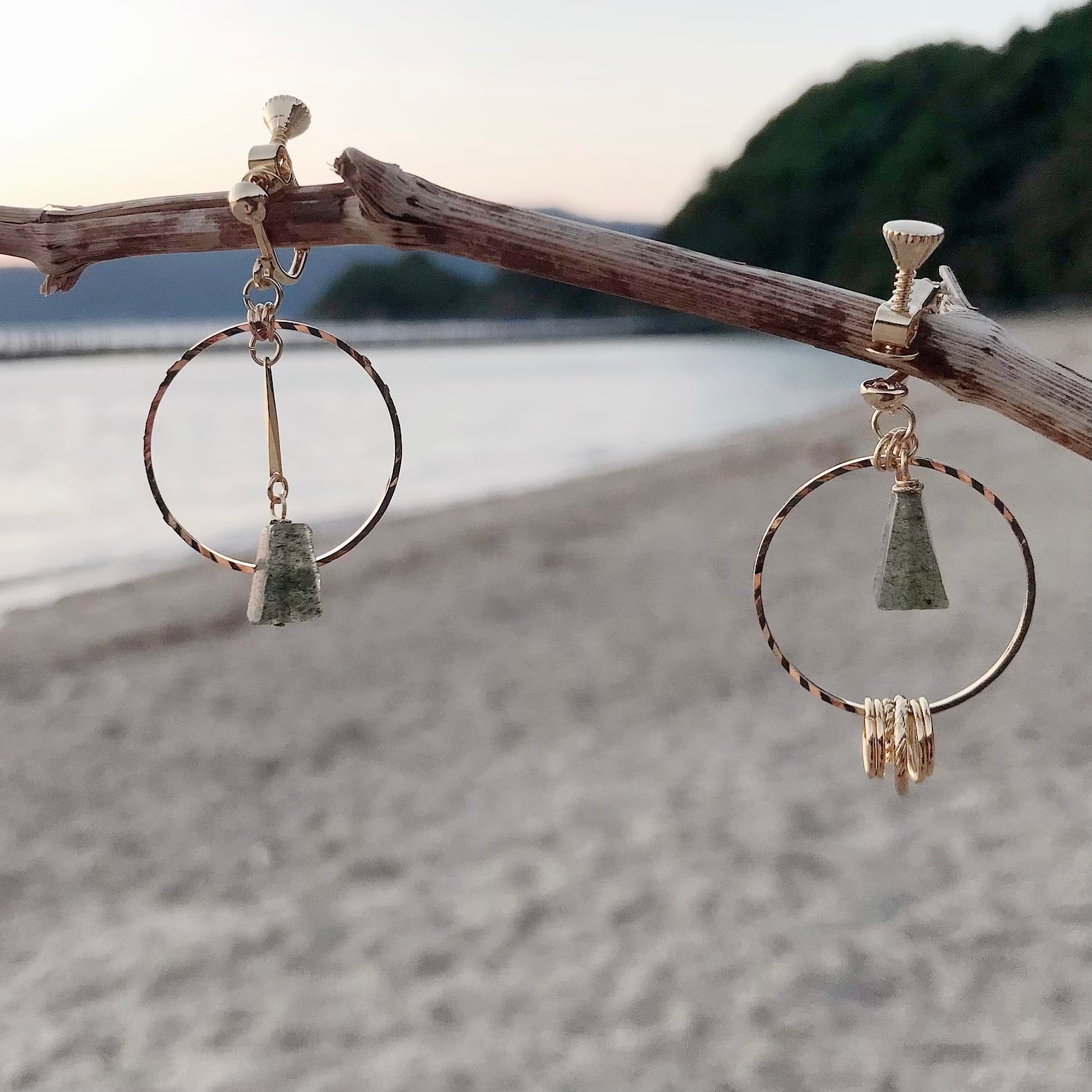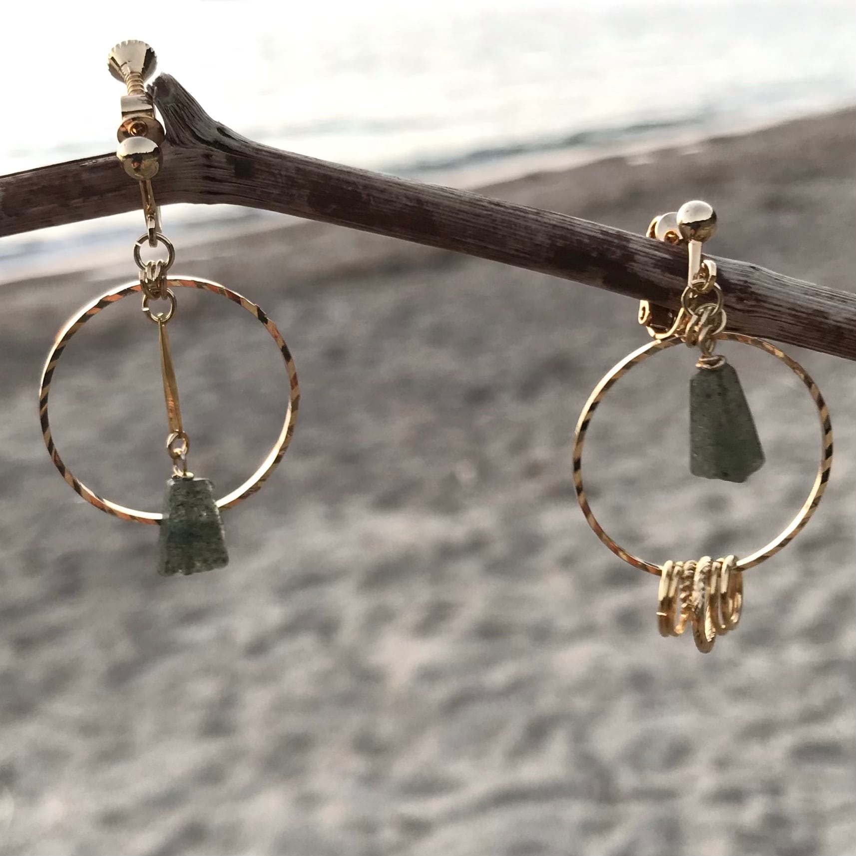 ラブラドライトを使用したエレガントなフープアシンメトリーイヤリング。