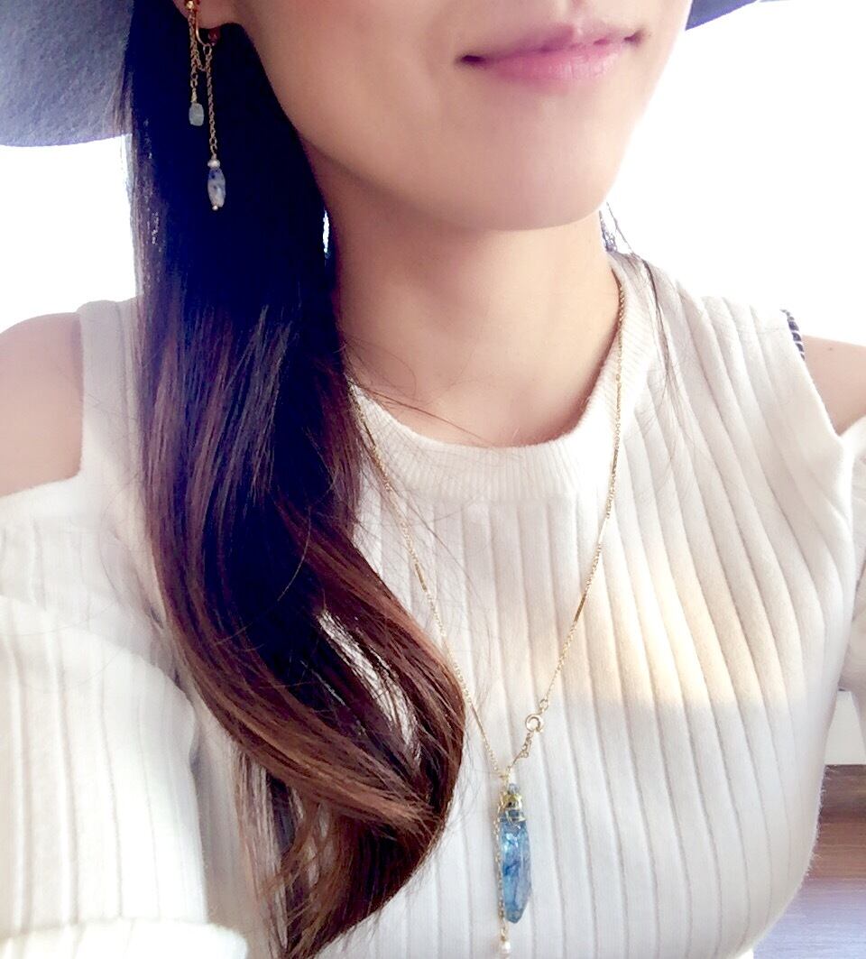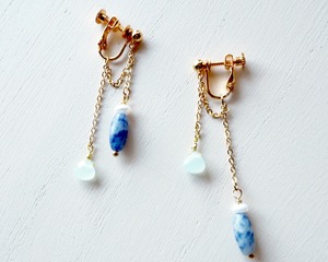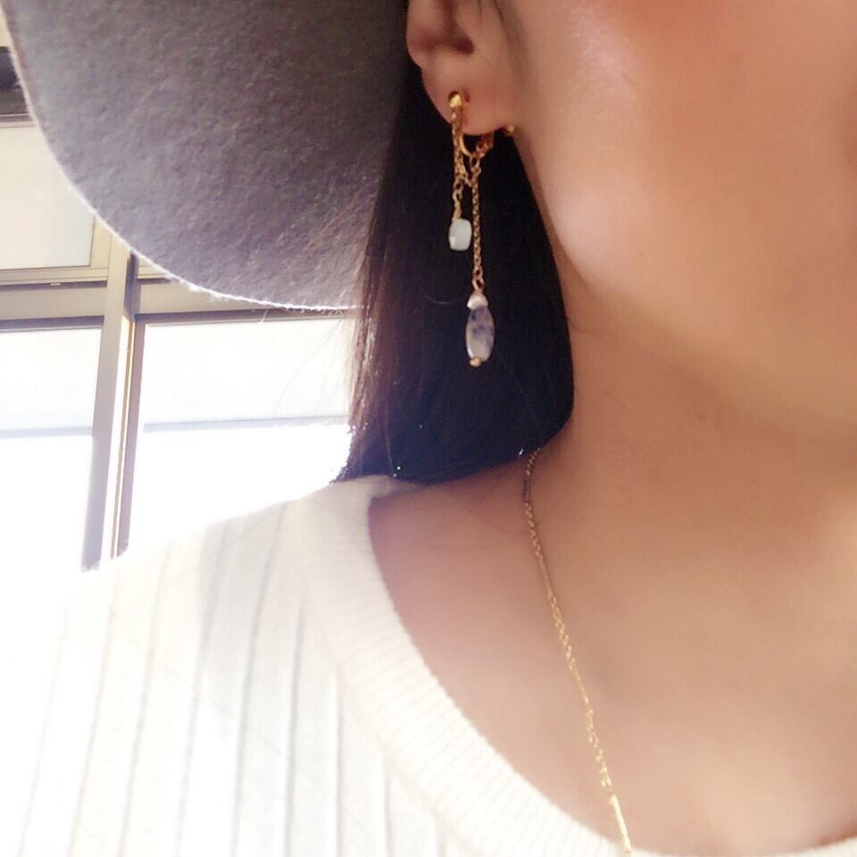 水色のカラーがかわいいアクアクオーツにブルーのマーブル柄のソーダライトと淡水パールがついた可愛らしいピアスです。よく見ると左右非対称でアシンメトリーになっています。