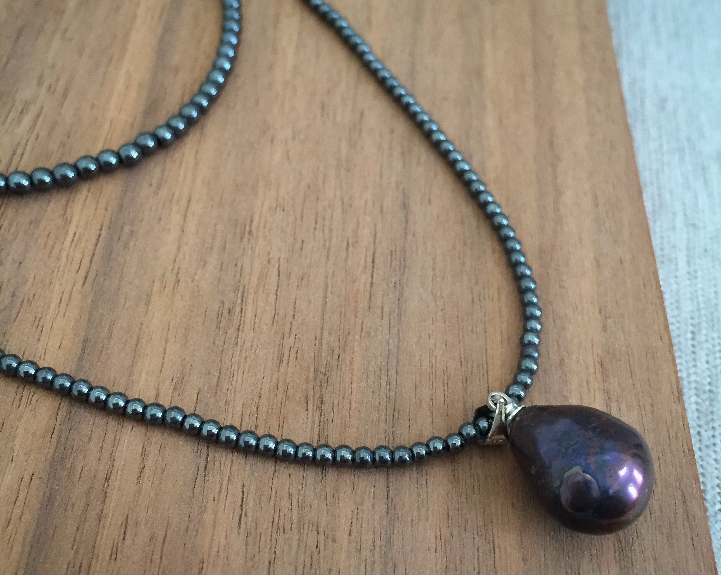 2連のヘマタイトのチェーンに大きめな一粒パールを合わせたネックレスです。
