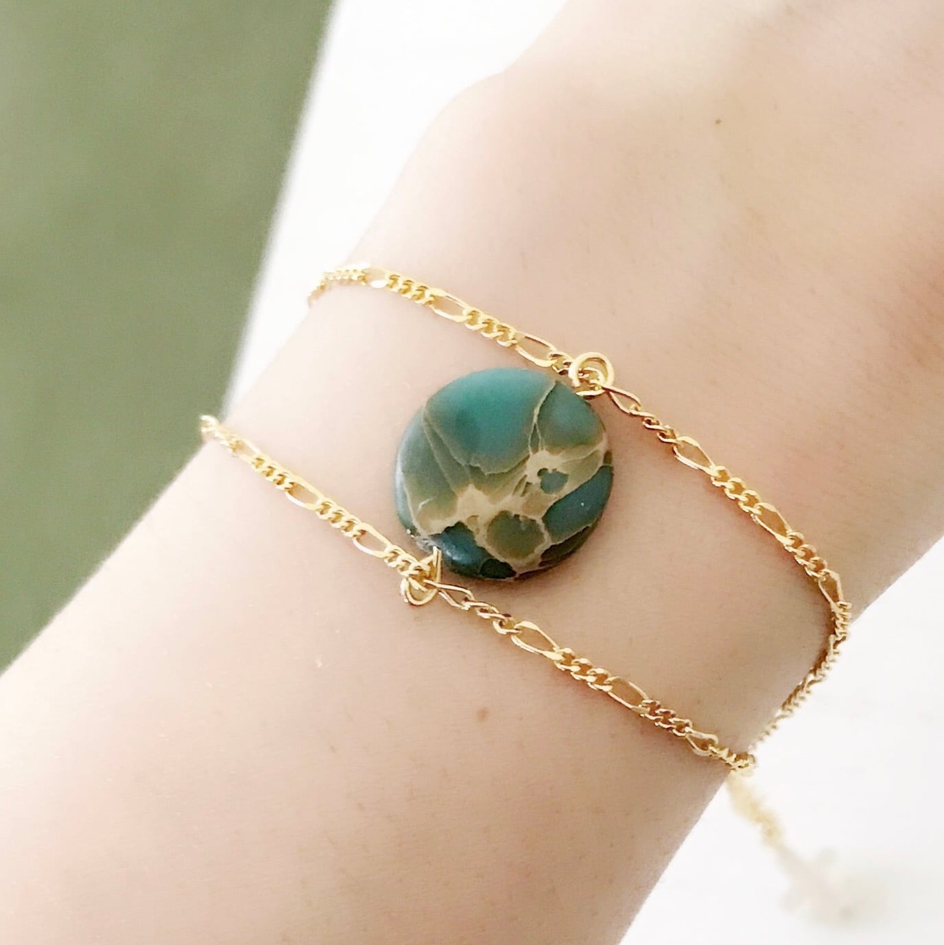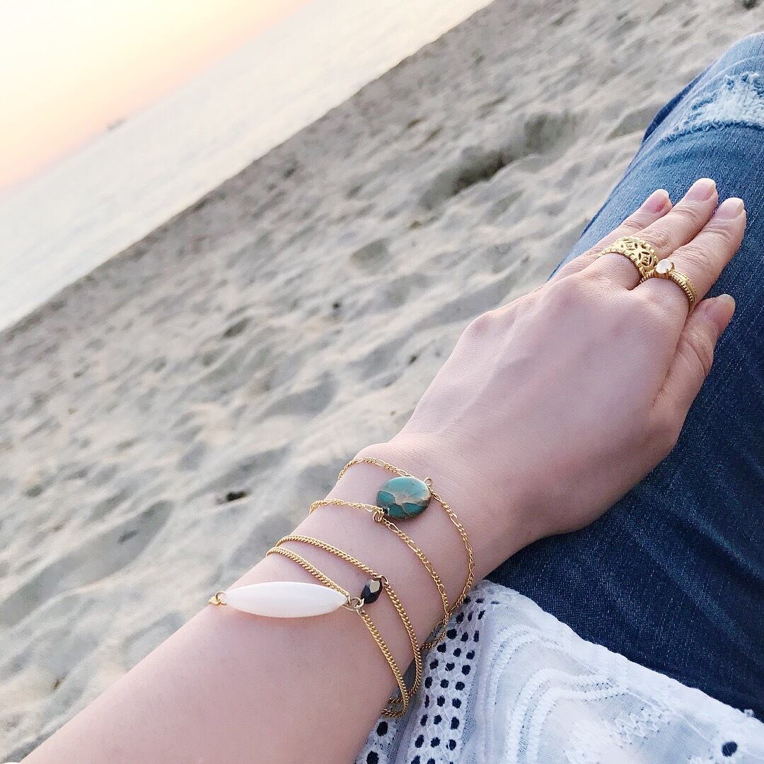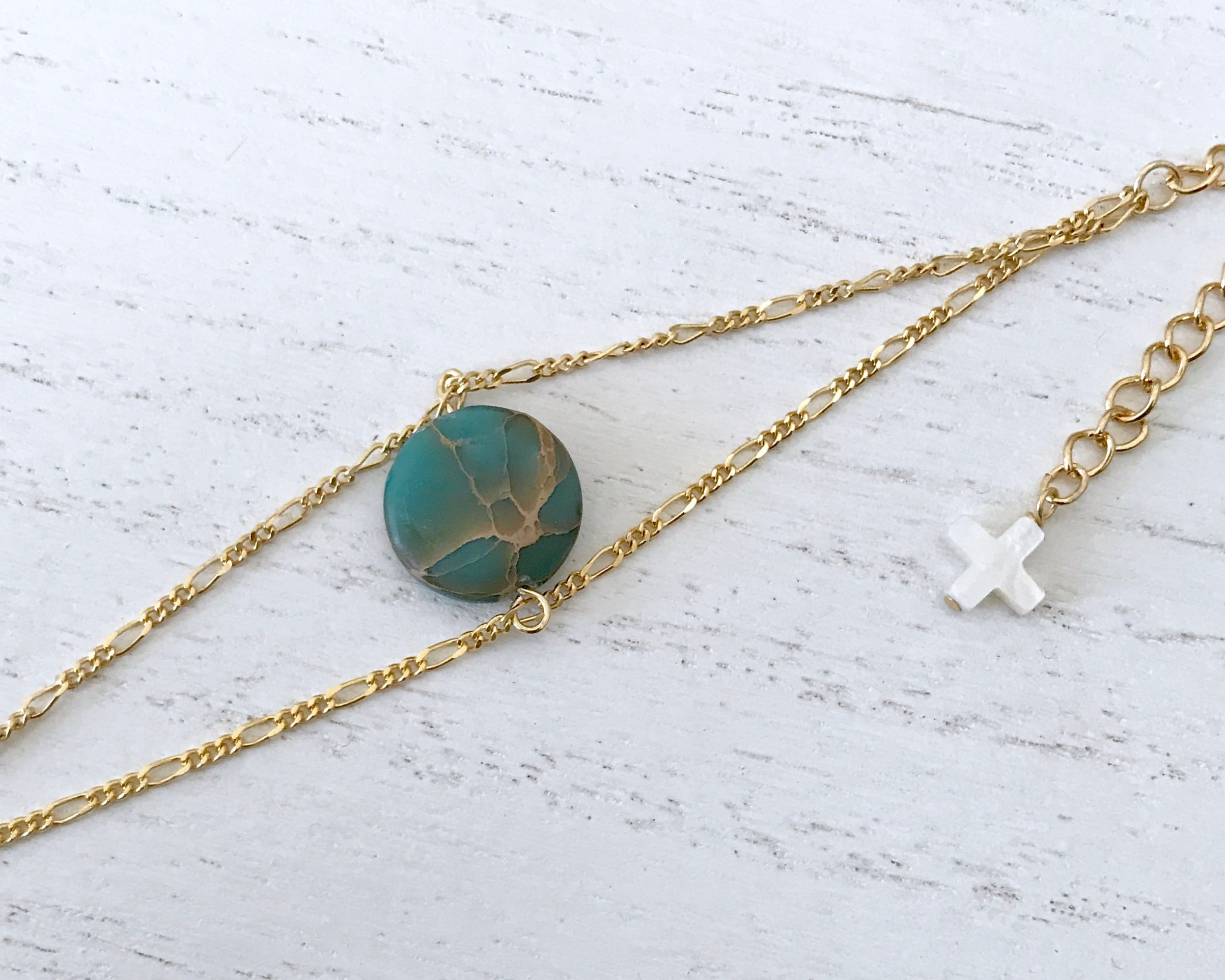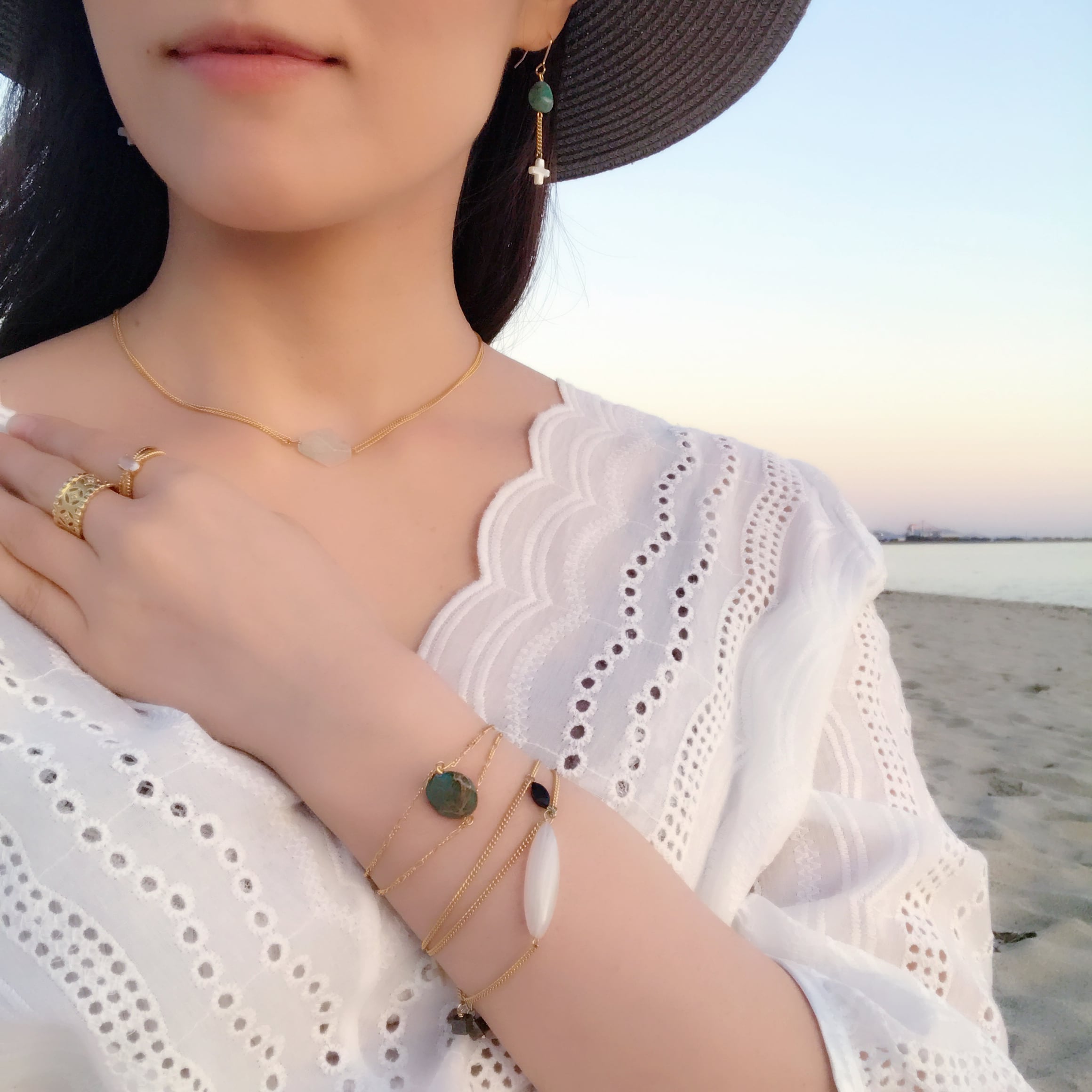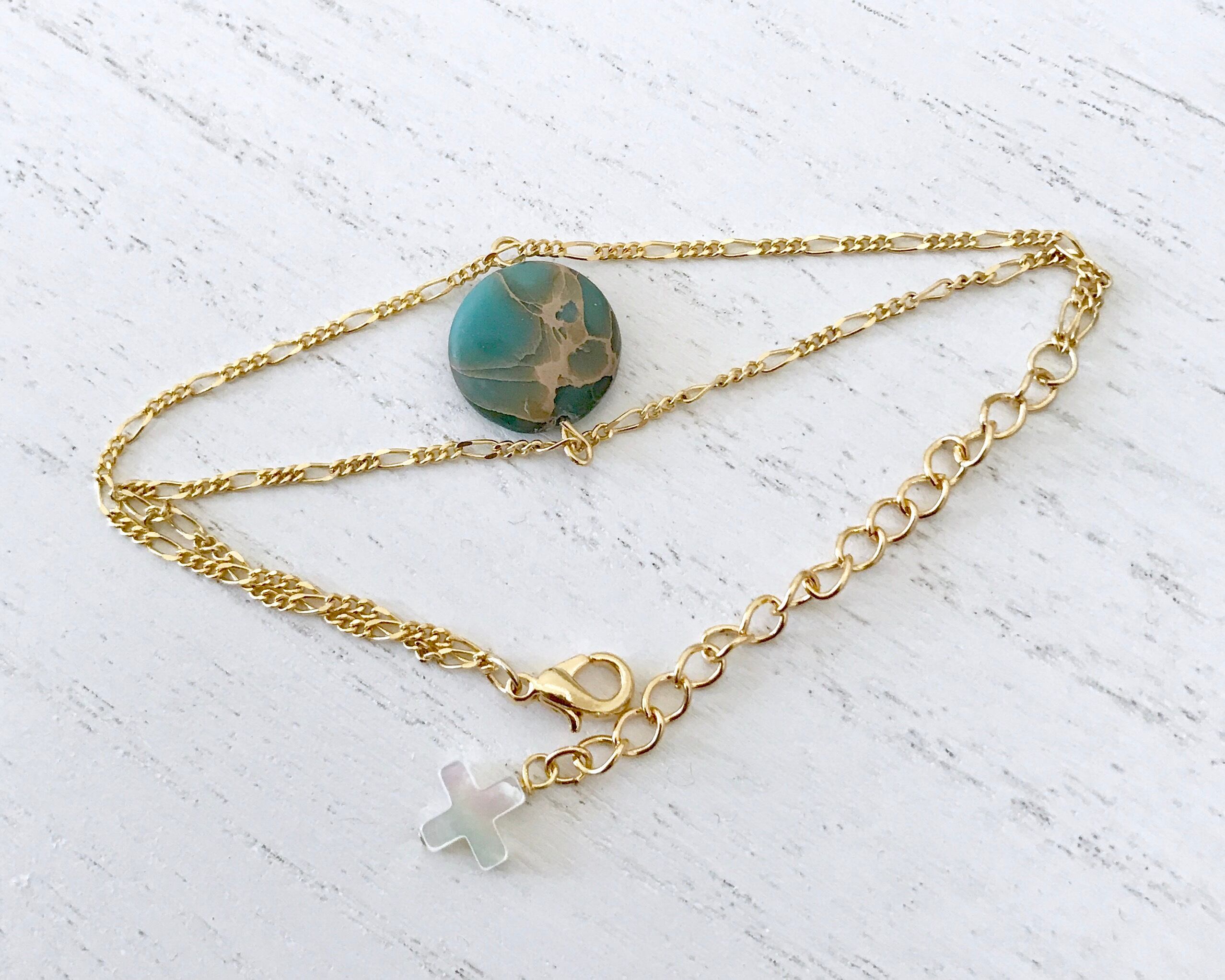 エメラルドグリーンの海を思わせるジャスパーにアジャスターのエンディングはマザーオブパールのクロスをあわせました。